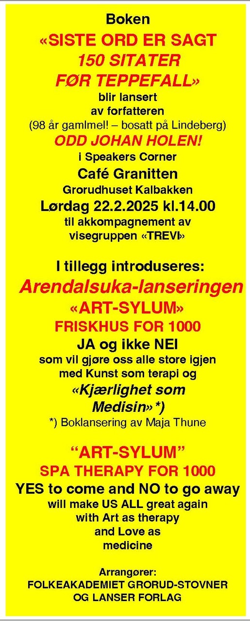 14 august, kl. 1530-1630. BYSTYRESALEN i Arendal.